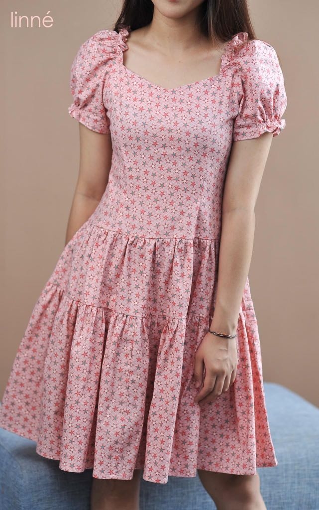 Váy thô Hàn chun vai 3 đoạn sao hồng